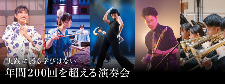 オーケストラ、吹奏楽などのクラシックから、ロック、ジャズ、ミュージカル、邦楽など、聴衆の心を引きつける多彩なコンサートの数々。多くの演奏体験を積み重ねることが、豊かな音楽性を育む糧となっています。