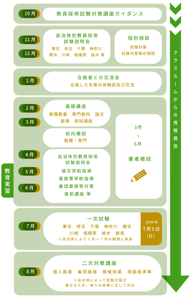 【開講科目】ガイダンス(個別相談)・小論文・模擬試験・集団討論・教職教養直前講座