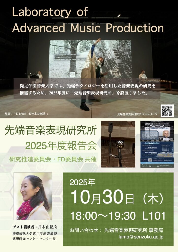 先端音楽表現研究所 2025年度報告会 2025-11-04 最終更新日時 : 2025-12-12 admin 当研究所の研究および活動内容について学内向けの報告会を実施しました。 ゲスト講演者として、慶應義塾大学理工学部准教授で同大学観想研究センター代表の 井本由紀先生をお招きして、当研究所と米国スタンフォード大学音楽学部の委嘱により 制作されたメディアシアター作品「47Trees - 47の木の物語」の作品コンセプトや研究テーマについて お話しいただきました。 \ 最新情報をチェック / FacebookXBlueskyHatenaCopy