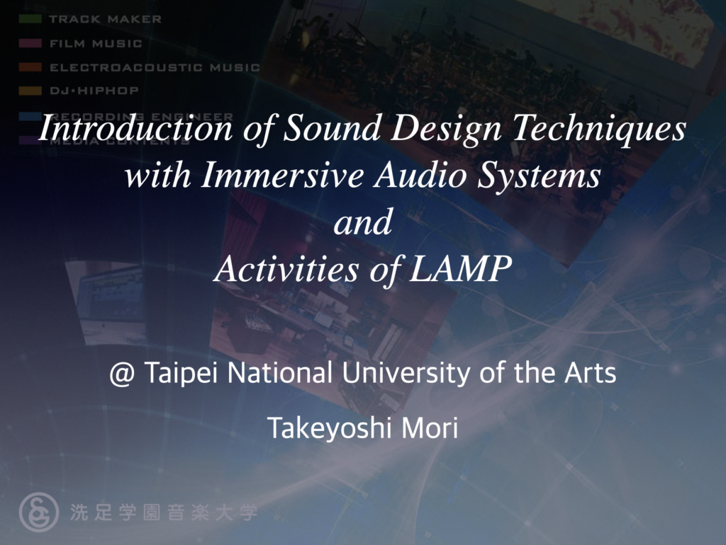 台湾の国立台北芸術大学を当研究所所長の森威功教授が訪問し、サウンドデザインについての特別講座と当研究所(LAMP)の活動を紹介して、同大学MIT(Music and Image Trans-disciplinary Program)プログラムの教員や学生の皆さんと交流を深めました。