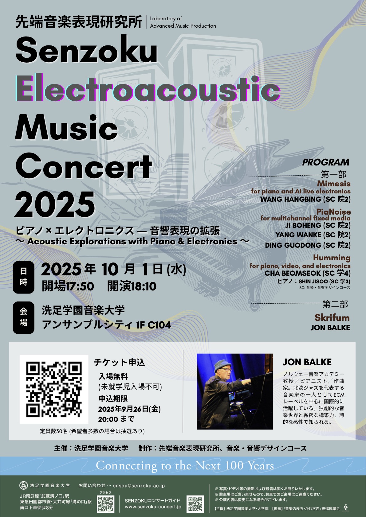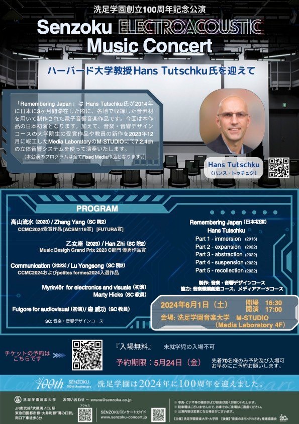ハーバード大学教授ハンス・トゥチュク氏をお招きして電子音響音楽コンサートを開催しました。また、音楽・音響デザインコース学生のコンクー入賞作品および教員の作品も立体音響システムで発表されました。