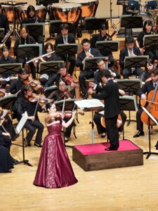 9月27日(土)に大学院室内室内管弦楽団の定期演奏会が行われ、各コースから選抜された6人が協奏曲を演奏しました。弦楽器コースからは大学院1年生のマノユ瑠南がブルッフのヴァイオリン協奏曲を演奏し、会場から大きな拍手を受けていました。演奏は集中力のある、情熱的な演奏でブルッフの持つ情感をしっかりと表現していました。 オーケストラを担当していた大学院生たちも、難曲の多いプログラムをしっかりと演奏し、ソリストたちをよくサポートしていました。