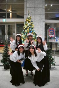 社会連携・社会貢献事務局の依頼で、12月14日(日)16:00より、ミューザ川崎オフィス棟2Fにて開催の『ミューザおんがく会 Xmasライブ』で、2年生有志の小澤美柚さん、菊池望叶さん、日比咲千帆さん、細島奏帆さん、三好咲彩さんがハンドベル、鍵盤ハーモニカ、ピアノ等を演奏しました。