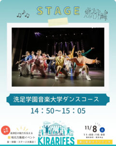 ダンスコース卒業生&在学生4チームが、ストリートダンス&ジャズダンスのナンバーを披露します。 学生ならではのフレッシュな感性と、卒業生の磨かれた表現力が融合した熱いステージをお届けいたします。 皆さま、是非お越しください。