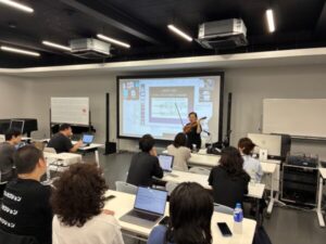 音楽性を深め、革新性よりも熟練を追求する目的で開発されたモーションセンサー「MUGIC®(Music/User Gesture Interface Control)」についてヴァイオリン演奏を交えて紹介していただきました。芸術の新たな可能性や、アートの境界を超えて拡がるユーザーの現状、そして本技術に至った経緯についても触れられました。弦楽器コースやJAMコースの学生も参加し、音楽的な視野を拡げる素晴らしい学びの機会となりました。