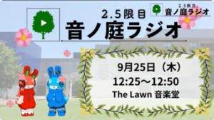 企画名の「2.5限目 音ノ庭ラジオ」は、2限と3限の間のお昼休みを2.5限目とし、大学の中心にある中庭The Lawnの音楽堂から様々な音楽をお届けするラジオ、という意味で学生達が命名しました。