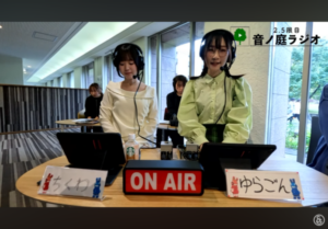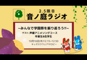 10月16日(木)の昼休み、キッズスクウェア1Fロビーから、音楽大学公開ラジオ『2.5限目 音ノ庭ラジオ#38』をライブ配信しました。ゲストに声優アニメソングコースの卒業生と在学生を迎えて「みんなで学園祭をふりかえろう!!」というタイトルで10月11日(土)と12日(日)に開催された洗足学園フェスティバルのダイジェストムービーと共にお送りしました。また、パーソナリティの「ゆらごん」の主宰する劇団あさい(仮)は学園祭でオリジナル舞台演劇を上演しましたが、そのメンバーも出演しました。