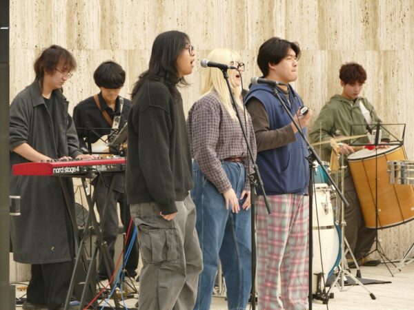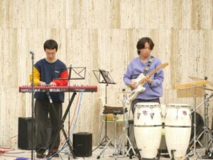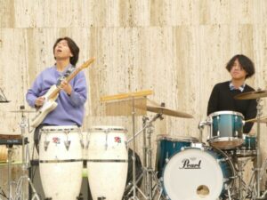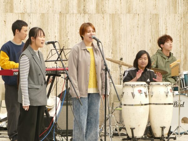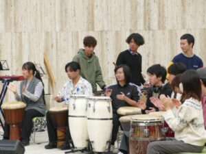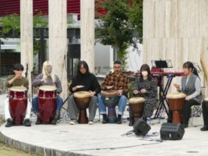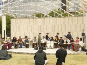 クリストファー・ハーディ先生の演奏会実習「くりゼミ」は、自分の「手」で世界を奏でることをテーマに、ラテン、西アフリカ、中東、南米、手で叩く世界の民族打楽器の演奏法を習得することを目指しています。打楽器の原点を学び、コンサートで実践して、自分のグルーヴを磨き、コミュニケーション&アンサンブル能力をアップさせることを目標にしています。芝生広場に集まった、学生や教職員がくりゼミの素晴らしい演奏を楽しみました。