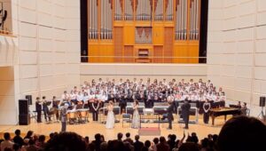 第2部「幼児教育保育科 第九コンサート」では、青島広志先生の司会・指揮のもと、洗足こども短期大学 幼児教育保育科合唱団が、ソプラノ・飯田千夏先生、アルト・紙谷弘子先生、テノール・山本耕平先生、バス・武田直之先生と共に、電子オルガンの伴奏で、交響曲第9番 ニ短調 Op.125 より第4楽章を披露しました。この日のために、合唱指導・統括の藤原規生先生の指導のもと、授業で学んだ成果を見事に発揮しました。