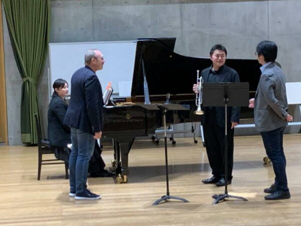今回、管楽器コースのトランペット専攻の3名がメラーツ先生のマスタークラスを受講しました。メラーツ先生は3名の演奏を拝聴した後、それぞれの学生の表現力を高めるため、演奏の強弱やタンギングなどについて模範演奏を交えながら具体的な指導をしてくださいました。先生の的確な助言により、学生の演奏はレッスン中にめざましく向上しました。なお、マスタークラスの通訳は、ユーフォニアムの新井秀昇先生、伴奏は三代川恭子先生にご対応いただきました。
