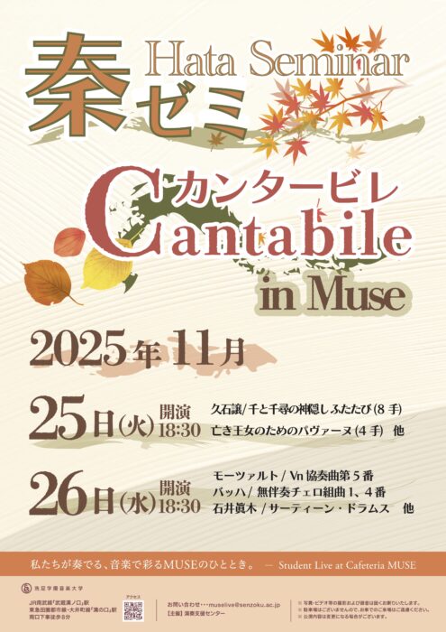 2025年度のStudent Live at Cafeteria MUSE 第30回、第31回を11月25日(火)、26日(水)の2夜にわたり開催しました。秦ゼミによる「秦ゼミカンタービレin MUSE」の公演として日頃の練習の成果を披露しました。