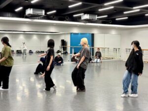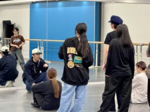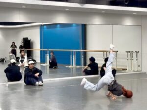 僕はブレイキンというジャンルを軸にやっているので、授業では「フロア」や「技」をメインに教えています。学生の中には初めて挑戦する人や苦手意識を持っている人もいると思うのですが、年に2回ある公演に向けて目標を高く設定し、「技」という成否が明確な課題にチャレンジしてもらっています。「技」を習得してフロアに入る感覚を養えれば、将来ダンスの道に進んでいく学生にとって一つの武器になると思うので、みんながチャレンジできるように和気あいあいとした空気を大事にしながらレッスンしています。 |
