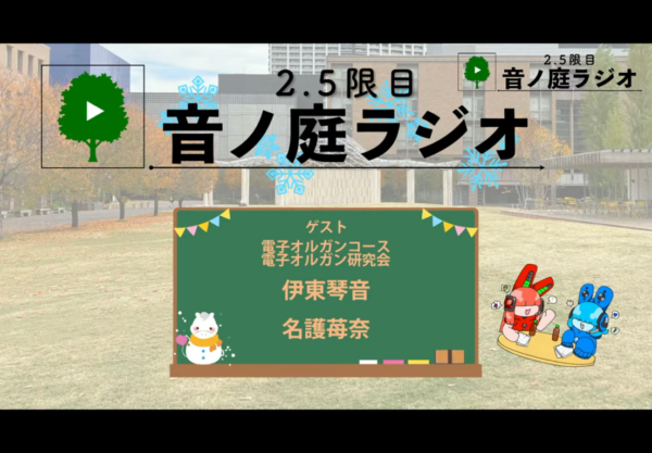 1月21日(水)の昼休み、キッズスクウェア1Fロビーから、音楽大学公開ラジオ『2.5限目 音ノ庭ラジオ#41』をライブ配信しました。ゲストに電子オルガンコース 電子オルガン研究会の伊東琴音さんと名護苺奈さんをお迎えして、電子オルガンコースについてのお話やお二人による電子オルガンの演奏をお送りしました。お二人のお話と演奏はぜひアーカイブからご視聴ください