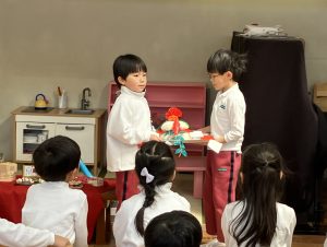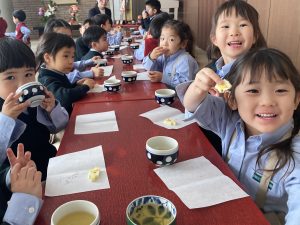 幼稚園では、日本の伝統行事を大切にしながら、「お正月の集い」を行っています。 お正月についてのお話を聞いた後、みんなで日本茶とお干菓子をいただき、1年間を健康に過ごせるよう願いました。