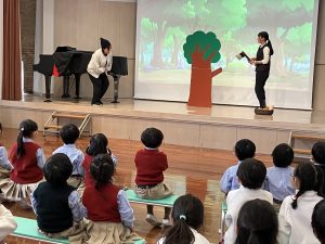 先生たちからのプレゼントとして、劇「金のがちょう」を披露すると、子どもたちは目を輝かせながら、楽しそうに見入っていました。 笑顔あふれる、心に残る誕生会となりました。