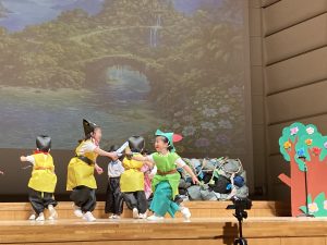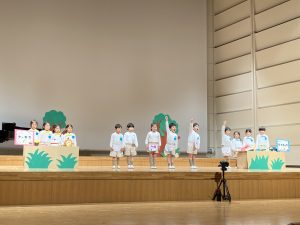 子どもたちは、これまで表現遊びや劇あそび、歌や合奏などの練習を重ね、この日を心待ちにしていました。たくさんのお客様にご来場いただき、大きなホールで出番を待つ子どもたちの表情には緊張も見られましたが、いざ舞台に立つと、のびのびと表現したり、友だちと声を合わせて一生懸命に台詞を言ったりと、堂々とした姿を見せてくれました。