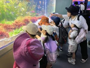 また、アクアミュージアムでは、色とりどりの魚や大きなホッキョクグマの姿に子どもたちは目を輝かせ、水槽に顔を近づけて食い入るように観察していました。展示の紹介文を読みながら、「あのサメは胸びれにキズがあるんだって」と友だち同士で会話を交わす姿も見られ、興味や発見を共有し合う様子が印象的でした。