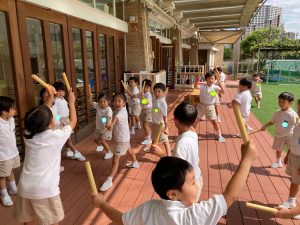 遊びの中でも「先生、音楽かけて!」と友だちを誘い合い、元気に踊る姿があります。園庭やテラスから音楽が流れると、他の学年の子どもたちも自然と集まり、一緒にお遊戯を楽しむこともあります。