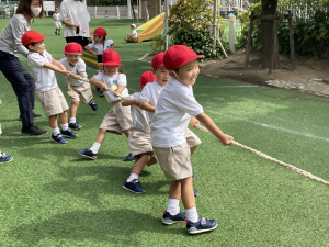 年少組 運動会でお兄さんやお姉さんの競技を見て、「僕たちもやりたい!」と目を輝かせる子どもたち。 遊びの中で、綱引きを楽しみました。