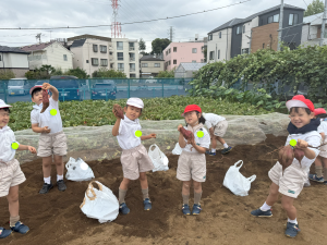 昨日、年長組と年中組の子どもたちは、畑まで30分ほど歩いておいもほりに出かけました。道中では、狭い道ですれ違う人や自転車に気を配りながら、譲り合って歩く姿も見られ、公共の場でのマナーを意識する良い機会となりました。歩いている途中では、きれいな色の花を見つけたり、看板に興味を持ったりと、さまざまな発見もありました。