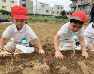 畑に到着しご挨拶をしてから、おいもほりがスタート。少し顔を出したおいもを無理に引っ張ることはせず、そっと丁寧に土を掘り進め、つるがついたままの立派なおいもを掘り起こすと、大喜びでした。