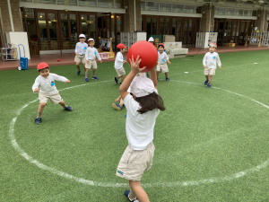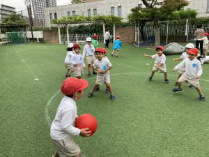 園庭で集まった友だちと「なかあて」をして遊びました。 最初はルールを確かめながら行っていましたが、少しずつわかってくると、中の人はボールに当たらないようにすばやく逃げたり、外の人はねらいを定めて投げたりと、元気いっぱいに楽しんでいました。