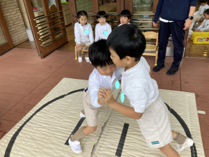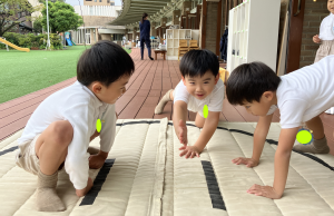 年長・年中組 友だちとお相撲で力比べをしてあそびました。また、年長組になると、行司役をしたり対戦 表を作って遊びを進めています。