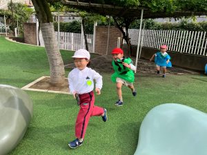 完成すると元気に「出発!」と園庭へ出て、困っている友だちを助けたり、忍者の修行に挑戦したりと、夢中で忍者になりきって楽しんでいました。