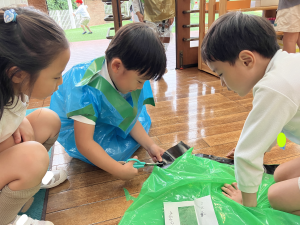 先日は「にんじゃになる!」という一言から想像がふくらみ、「にんじゃごっこ」が始まりました。友だちと力を合わせて身につける物を作ったり、手裏剣や剣などの道具を工夫して作ったりする姿が見られました。