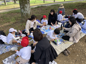 年少組は保護者の方と一緒に園内を散策したり、広場で体を動かして遊んだりと、親子で楽しい時間を過ごしました。 年中組は白鳥湖の橋を渡ったり、自分で作った“どんぐりバッグ”にたくさんのどんぐりを集めたりして、秋ならではの自然を満喫しました。