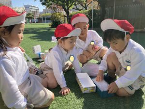 少し前までは、箱と箱をつなげて何かに見立てて楽しむ“見立て遊び”が盛んで、イメージの世界を広げながら遊ぶ、年少組ならではの姿が見られました。