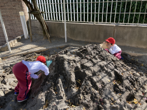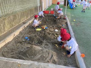 年少組 砂場では、山を作って木を生やしたり、道路を作って車を走らせたりして、思い思いに遊びを楽しんでいます。