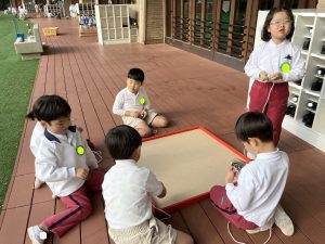年長組 ひも独楽をまわすことは難しいですが、何度も挑戦しています。