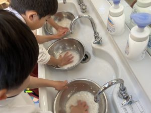 丁寧にお米を研ぎ、「きれいになったよ」と嬉しそうに話す姿も見られました。