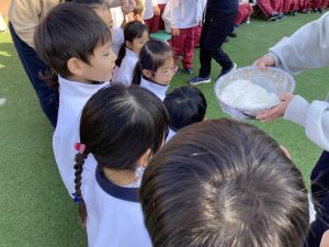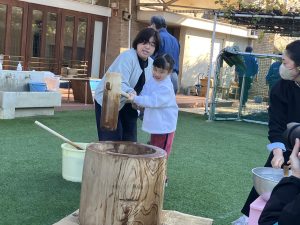 昨日、年長組はお米を研ぐところから経験し、そのもち米を使ってお餅つきを行いました。
