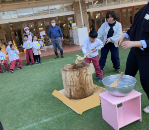 当日は、順番に杵を持ち、力を込めて元気よくお餅をつく子どもたち。「よいしょ!」「がんばれ!」と、声をそろえて掛け声をかけ合い、友だちを応援する声が園庭いっぱいに響いていました。